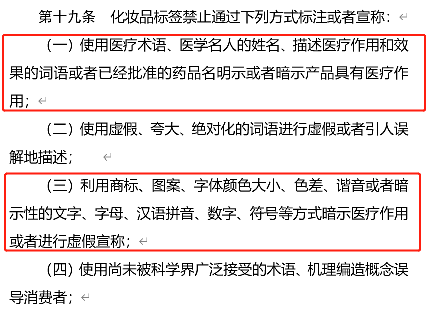 “绷带是常用医疗用品,用于化妆品属于涉医宣称。”某备案机构负责人表示。根据《化妆品标签管理办法》第十九条,“使用医疗术语、医学名人的姓名、描述医疗作用和效果的词语或者已经批准的药品名明示或者暗示产品具有医疗作用”,属于化妆品标签禁止标注或者宣称的方式。
